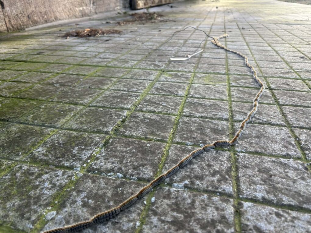 Αναφερόμαστε φυσικά στις κάμπιες των πεύκων (πιτυοκάμπη, Thaumetopoea pityocampa) που κάνουν την εμφάνιση τους αυτή την εποχή, από τέλη χειμώνα μέχρι και αρχές άνοιξης. Οι κάμπιες βγαίνουν από τα κουκούλια τους και κατεβαίνουν τα δέντρα, η μία πίσω από την άλλη, σχηματίζοντας μια χαρακτηριστική γραμμή, ψάχνοντας να βρούν την κατάλληλη θέση στο έδαφος όπου θα γίνει η νύμφωση. Η νύμφωση είναι η φυσιολογική διαδικασία μεταμόρφωσης τους από κάμπια σε χρυσαλλίδα.