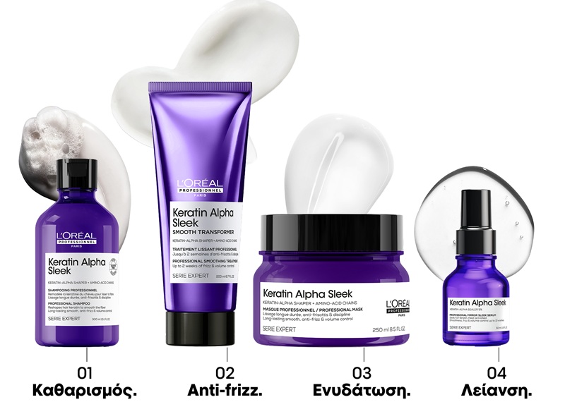 Η Keratin Alpha Sleek γεννήθηκε μέσα στα κομμωτήρια και αναπτύχθηκε σε συνεργασία με επαγγελματίες. Μέχρι πρότινος, αυτή η υβριδική τεχνολογία διαμόρφωσης υφής και περιποίησης βρισκόταν αποκλειστικά στα χέρια των ειδικών.