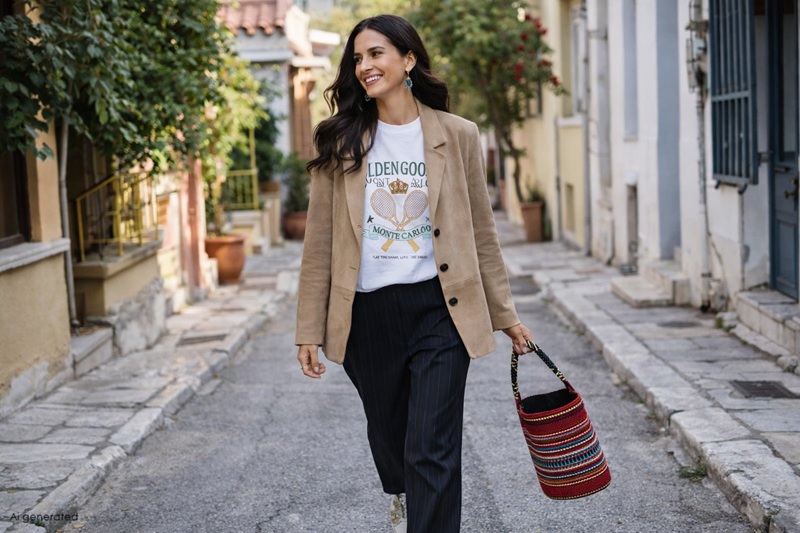 Για έναν sophisticated χαρακτήρα στο outfit, συνδυάζουμε το Tee με αυτό το navy blue παντελόνι από το Massimo Dutti με τη λεπτή ρίγα για ένα busy lady vibe with charm. Εναλλακτικά για κάτι πιο θηλυκό κι ανέμελο, you can never go wrong with a denim skirt! Η συγκεκριμένη σε γραμμή άλφα είναι ό,τι πρέπει για μία street chic πινελιά. Ενώ για να είμαστε προετοιμασμένες για τον άστατο καιρό που μπορεί να προκύψει τις μέρες αυτές αυτό το μπεζ suede blazer είναι ιδανικό για ένα cozy and sophisticated look.